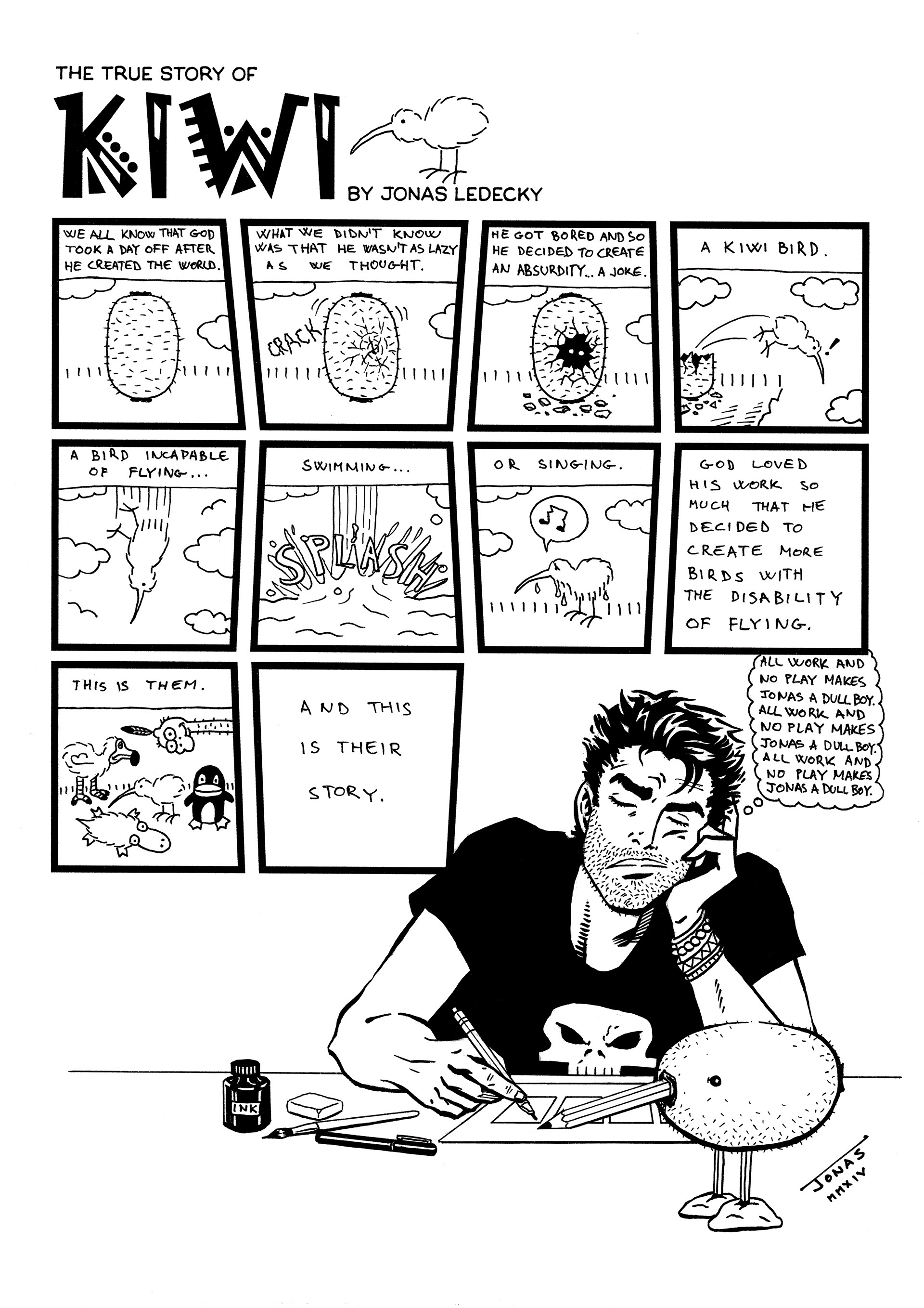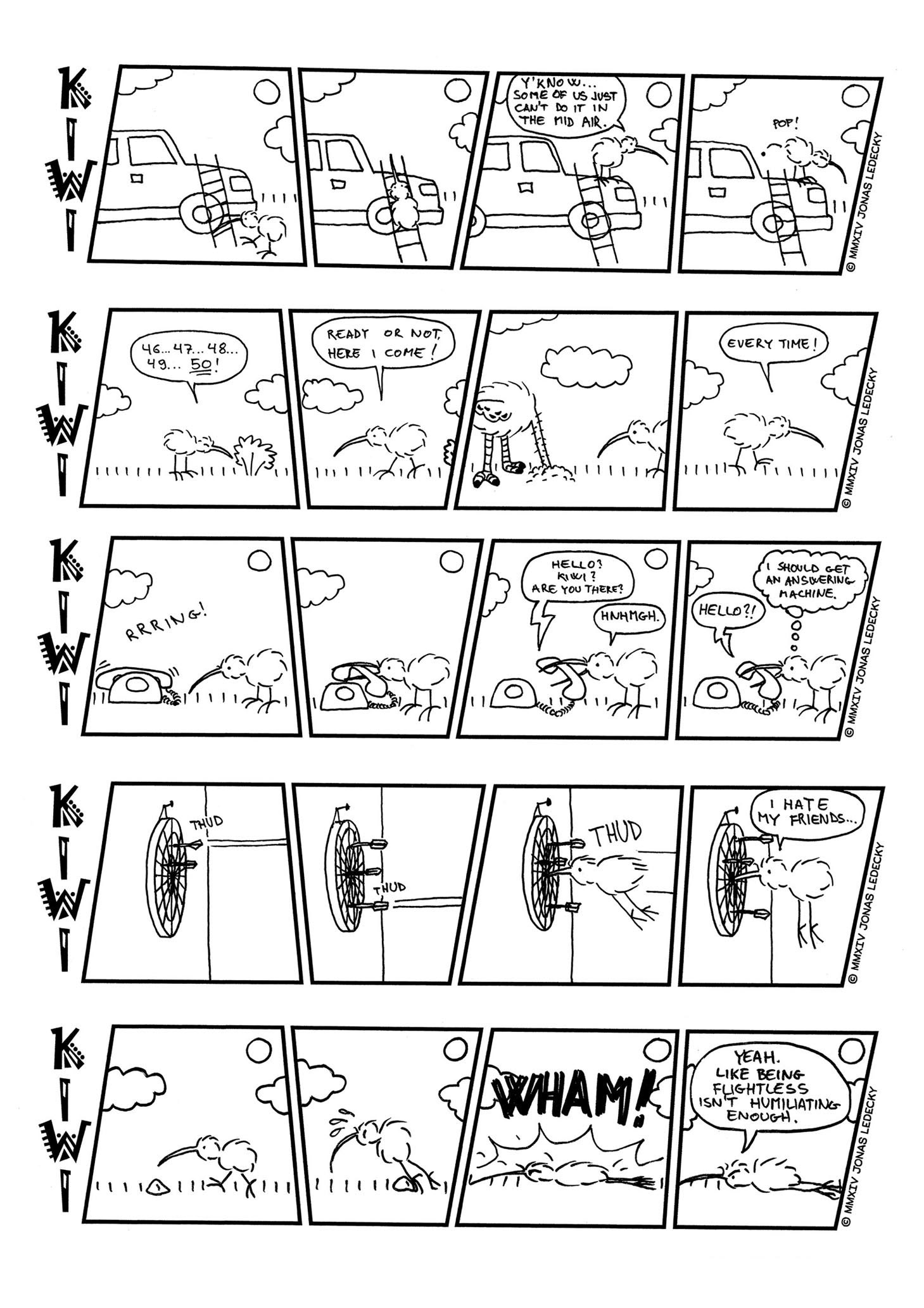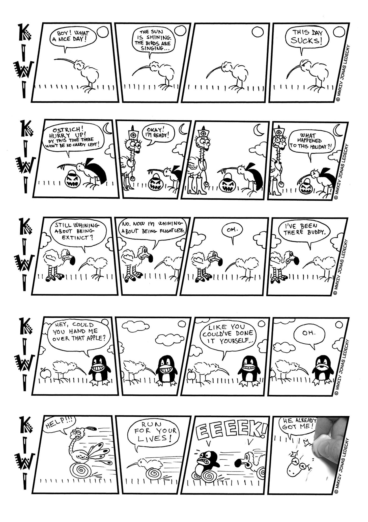 A comic strip about flightless birds. First published in 2009.